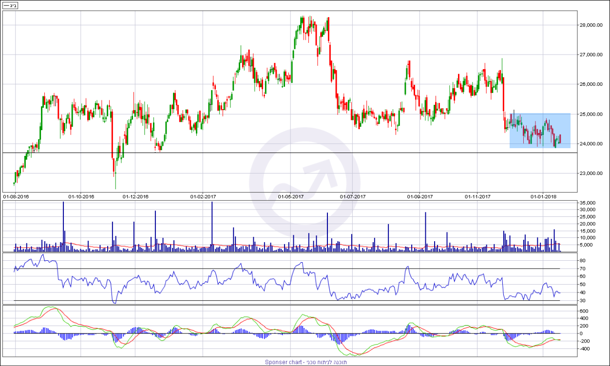 ניתן לראות בגרף המצורף לסקירה שהמניה מנסה להתבסס כחודש ימים סביב רמת תמיכה של 23900/850 נקודות שמחזיקה את המניה בשלב זה.