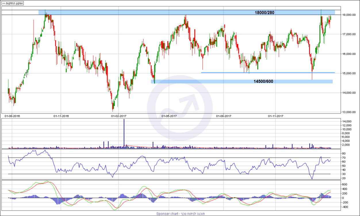 נעילה מעל 18000 שהיא רמת מחיר עגולה תהיה חיובית מאוד אך רצוי לראות אישור לפריצה מעל 18280 שהיא השיא התוך יומי במניה מספטמבר 2016 ומלפני שבועיים. במקרה זה המניה תפתח יעד עולה לאזור של 19500-20000 נקודות בטווח הקצר.