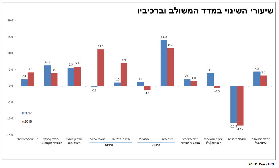 התפתחות רכיבי המדד המשולב תואמת תמונה זאת: קצב הגידול של משרות השכיר ירד ב-2018 ל-1.5%, בדומה לקצב הגידול של האוכלוסייה בגילי העבודה העיקריים (לעומת 2% ב-2017) ואילו רכיבי היבוא גדלו השנה בקצב מהיר יותר בהשוואה לקצב אשתקד.