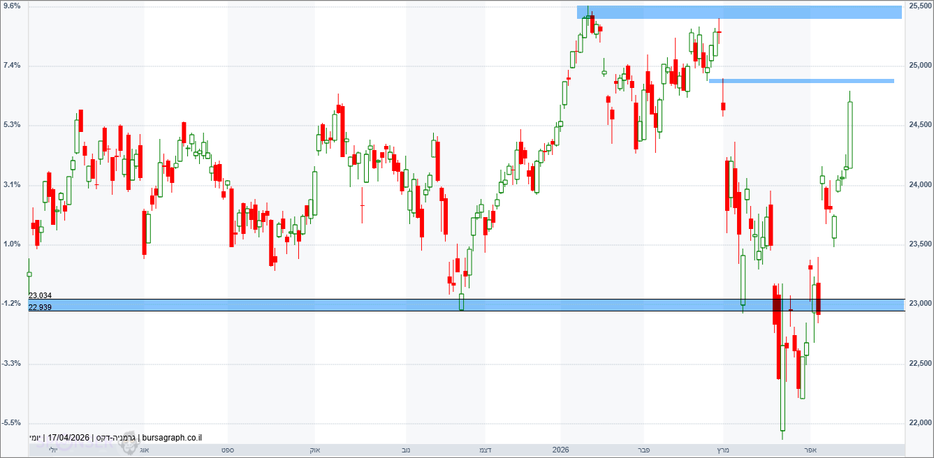 מדד ה-DAX הגרמני דובי הדקס החל את השבוע בירידות קלות וחיפש לסגור פער מחירים פתוח, אך המשיך עם יציאה קדימה בעיקר ביום המסחר האחרון של השבוע שחיסל סופית את התיקון העולה. התנגדות קרובה משמעותית קיימת בשיא האחרון סביב 25,000/500 נקודות.