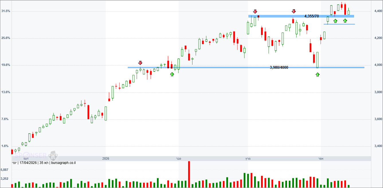 מדד ת”א 35 סגר את שבוע המסחר בירידה של 0.83% וננעל ברמה של 4,406.32 נקודות. המומנטום החיובי של השוק נעצר מעט השבוע אך הדבר טבעי ביותר על אחת כמה וכמה שהוא נשאר מעל הגבוהים האחרונים ומתבסס מעל אזור הפריצה של 4,355/70 נקודות. מהבחינה הטכנית כל עוד המדד מחזיק מעל פער מחירים פתוח סביב 4,300 נקודות הכיוון חיובי לטווח הקצר והיעד לאזור של 4,800 נקודות נותר בעינו.