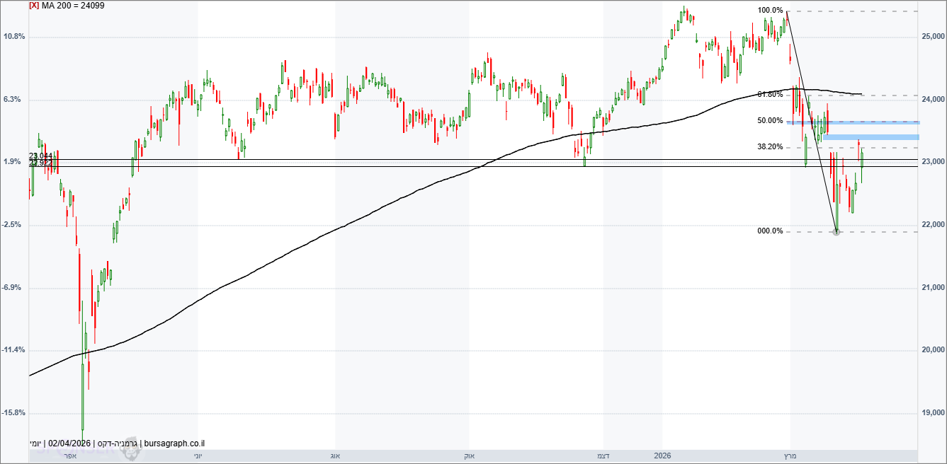 מדד ה-DAX הגרמני דובי האם המדד בדרך לסיים את התיקון היורד שלו? בשלב זה הדבר נראה סביר לאחר שנתמך לפני שבועיים סביב תיקון 50% למהלך העולה האחרון סביב 22,000 נקודות. אין זה אומר שנחזור לשיאים חדשים מהר אלא יותר תנועה צידית עם אפשרות להמשך תיקון מעלה. בשבוע האחרון המדד נסחר בתנודתיות גבוהה כשהוא כמעט סוגר פער מחירים יורד ונבלם בתיקון פיבו 38.2% לירידה האחרונה. התנגדות קרובה קיימת סביב 23,380/440 ומעל תיקון 50% לגל היורד סביב 23,650 נקודות.