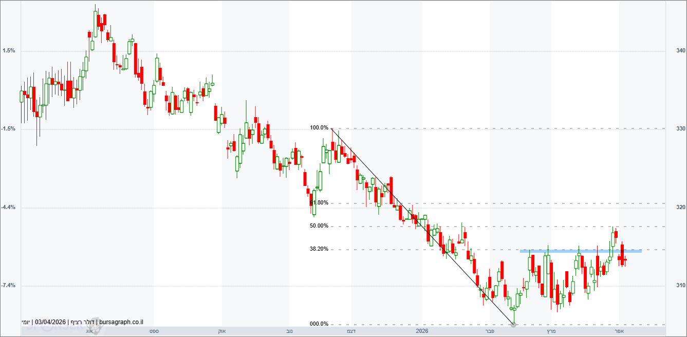 הדולר נסחר בתיקון טכני לירידות האחרון כשהוא עבר השבוע את אזור של 3.15 ונבלם ערב החג סביב 3.18 שהוא תיקון 50% לכל הירידה האחרונה. בשל המסחר הצר יחסית יש לא מעט אפשרויות לתמיכה כשהקרובה קיימת באזור של 3.10/11 לערך. תמיכה משמעותית יותר קיימת בשפל השנתי סביב 3.05/6.