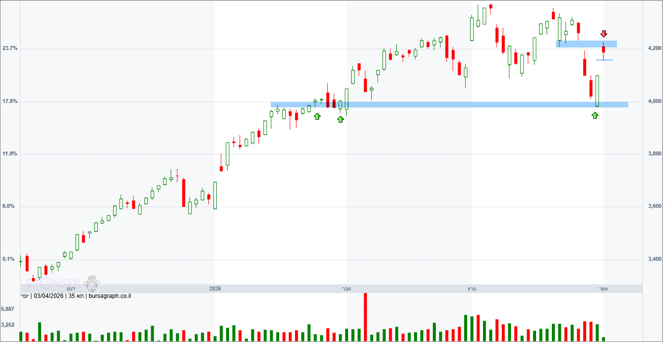 מדד המעו”ף – תחזית טכנית דובי מדד ת”א 35 סגר את שבוע המסחר בעליה של 2.2% וננעל ברמה של 4,189.31 נקודות. שבוע המסחר נפתח במגמה שלילית שהמשיך את המומנטום השלילי בשוק המקומי, סגירת רבעון פראית במיוחד ערב היציאה לחג הפסח הביאה להיפוך בתחנה האחרונה סביב 4,000 נקודות וההמשך חיובי מיום שישי בזכות תיקון חד בארה”ב ותמיכה משמעותית מהדואליות בראשות טאואר ואלביט החזירה את השוק מעלה. טכנית, המדד הגיע לרף התחתון סביב 3,980/4,000 נקודות והחזיק את התמיכה. העליה בשישי הביאה כמעט לסגירה של פער מחירים משבוע שעבר סביב 4,230 נקודות. תמיכה קרובה קיימת בפתח פער המחירים משישי 4,156 נקודות במידה ויחזק התיקון מעלה יכול להמשיך. בראיה רחבה, המדד המוביל זז הצידה בשלב זה.