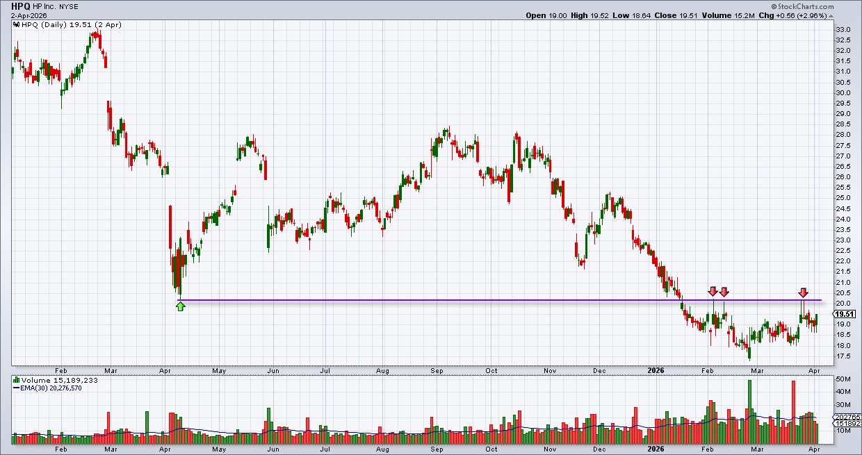 היולט פקארד (HPQ) energy מניות החברה נסחרות בבורסת ניו יורק. במהלך חודש ינואר המניה שברה כלפי מטה אל מתחת לשפל של שנת 2025 באזור 20.19 דולר והמשיכה לרדת עד לשפל שנרשם בסוף חודש פברואר באזור 17.3 דולר. מאז המניה התאוששה קלות ובמהלך התקופה מאז השבירה נוצרה תבנית היפוך לצורך תיקון עולה במסגרת המגמה היורדת הכללית. הטריגר לתחילת תיקון יתקבל בפריצה וסגירה מעל אזור 20.19 דולר בליווי מחזור מסחר תומך עם יעד קרוב באזור 22.4 דולר.