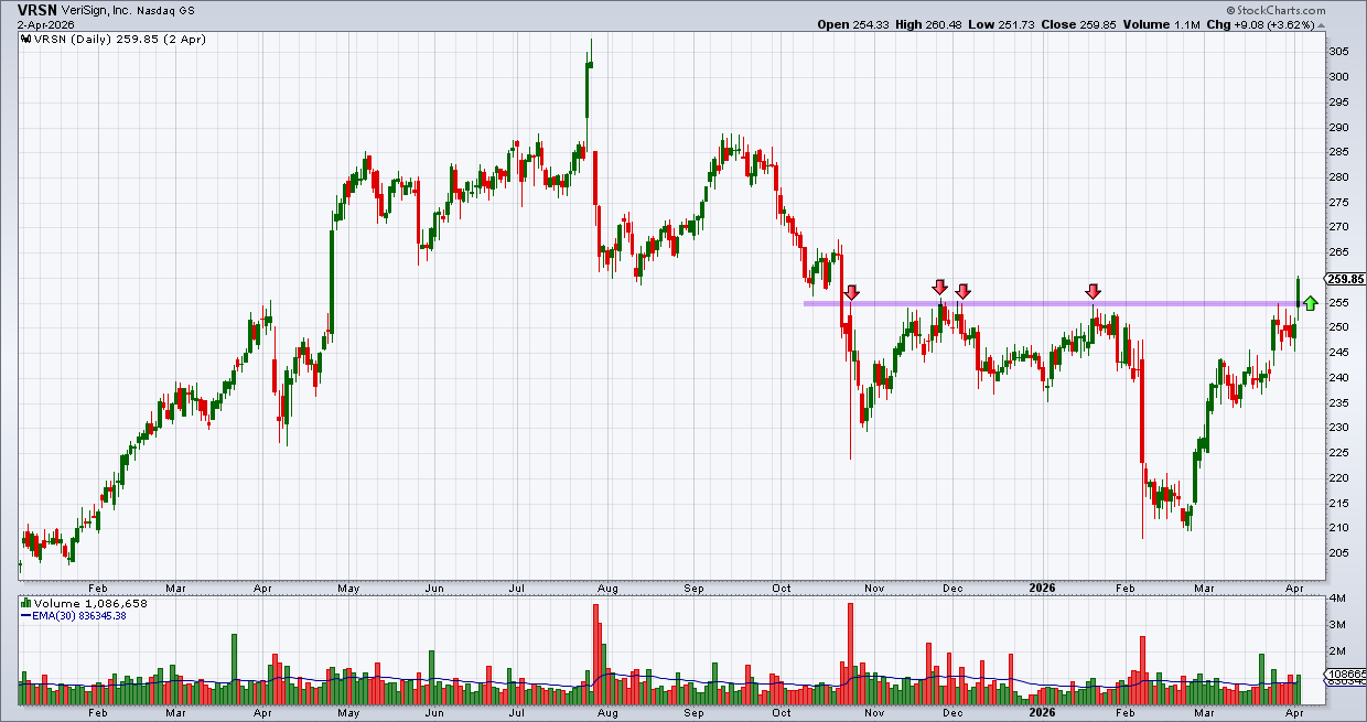 וריסיין (VRSN) energy מניות החברה נסחרות בבורסת הנאסד”ק. המניה פרצה ביום המסחר האחרון את אזור ההתנגדות האופקי 254.7-256.5 דולר בליווי מחזור מסחר תומך. קודם לפריצה המניה התבססה מספר ימים מתחת לאזור זה בתצורה חיובית אשר תמכה בפריצה וקיימת אפשרות, בשלב זה, להמשך התנועה העולה. אזור 278 דולר סומן כיעד קרוב.
